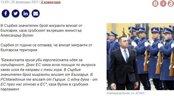 Ο υπουργός Εσωτερικών της Σερβίας Αλεξάνταρ Βουλίν προέβη σε σοβαρές δηλώσεις εναντίον της Ευρωπαϊκής Ένωσης, λέγοντας ότι «οι περισσότεροι παράνομοι μετανάστες εισέρχονται στη Σερβία από τη Βουλγαρία».
