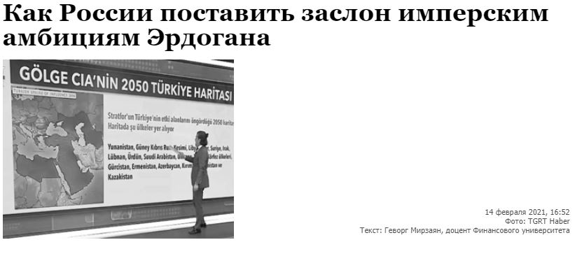 "Πώς μπορεί η Ρωσία να εμποδίσει τις αυτοκρατορικές φιλοδοξίες του Ερντογάν;", είναι ο τίτλος του ρωσικού δημοσιεύματος με φωτό την τουρκική τηλεόραση που παρουσίασε τον χάρτη του Stratfor