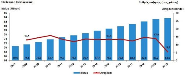 Ο πληθυσμός που διαμένει στην Τουρκία, σε σύγκριση με το προηγούμενο έτος στις 31 Δεκεμβρίου 2020 αυξήθηκε κατά 459 χιλιάδες 365 άτομα έφτασαν τα 83.614.362 άτομα.