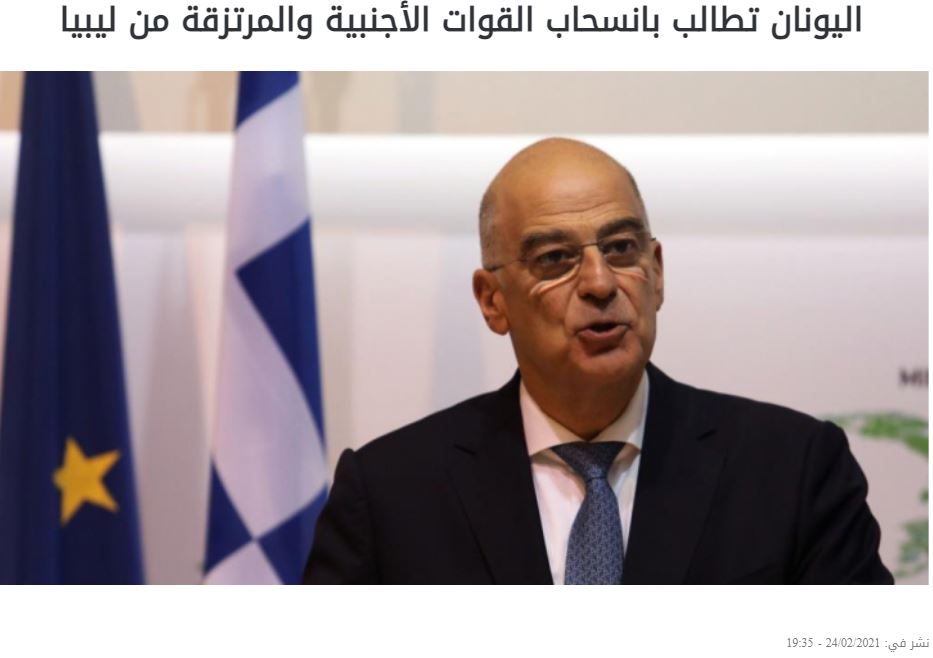 Ο Έλληνας υπουργός Εξωτερικών Νίκος Δένδιας ζήτησε σήμερα, Τετάρτη, την απόσυρση των ξένων δυνάμεων και μισθοφόρων από τη Λιβύη, γράφει λιβυκό δημοσίευμα.