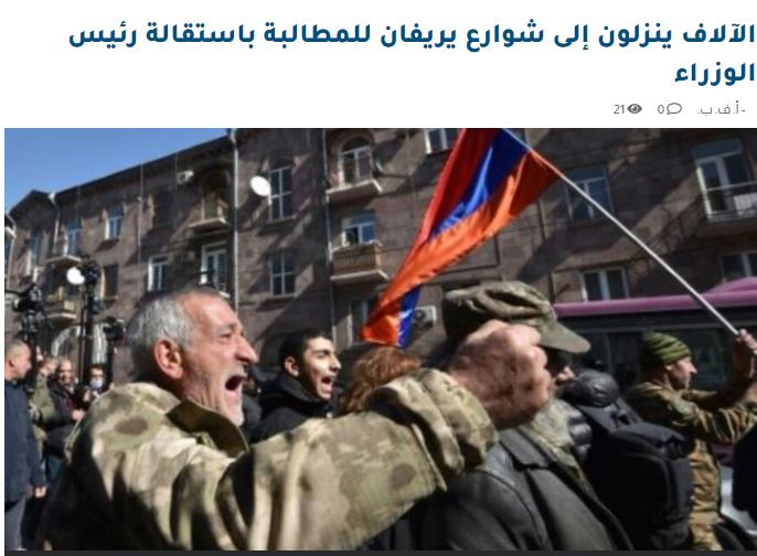 Χιλιάδες υποστηρικτές της αντιπολίτευσης κατέβηκαν στους δρόμους της πρωτεύουσας της Αρμενίας την Παρασκευή για να ζητήσουν την παραίτηση του πρωθυπουργού Νικόλ Πασινιάν, με φόντο την ήττα της χώρας του στον πόλεμο με το Αζερμπαϊτζάν πέρυσι, καθώς πολλοί την θεωρούσαν πατριωτική ντροπή.
