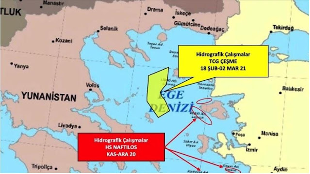 Δήλωσε ότι το ερευνητικό πλοίο "HS Naftilos" των Ελληνικών Ναυτικών Δυνάμεων πραγματοποίησε παρόμοιες μελέτες σε θαλάσσιες περιοχές που περιλάμβαναν διεθνή ύδατα βόρεια και δυτικά του νησιού Λέσβος και βόρεια των νησιών Χίου και Ικαρίας κατά τους μήνες Νοέμβριο και Δεκέμβριο του 2020.