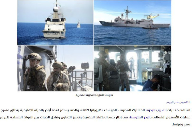 Άρχισε η κοινή Αιγυπτο-γαλλική ναυτική άσκηση «Κλεοπάτρα 2021», η οποία θα συνεχισθεί για αρκετές ημέρες στα ύδατα της Μεσογείου για την ενίσχυση της συνεργασίας και ανταλλαγής εμπειριών μεταξύ των ενόπλων δυνάμεων τόσο της Αιγύπτου όσο και της Γαλλίας, όπως σημειώνει η Egypt Today.
