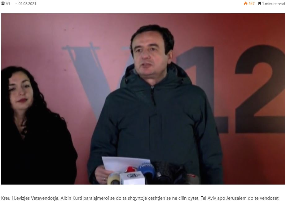 Ο αρχηγός του Κινήματος της Αυτοδιάθεσης (Vetëvendosje), Αλμπίν Κούρτι, ανακοίνωσε ότι θα εξετάσει το ζήτημα σε ποια πόλη, το Τελ Αβίβ ή την Ιερουσαλήμ, στην οποία θα βρίσκεται η Πρεσβεία του Κοσσυφοπεδίου στο Ισραήλ, λέγοντας ότι θα εξετάσουν τα «δεδομένα».