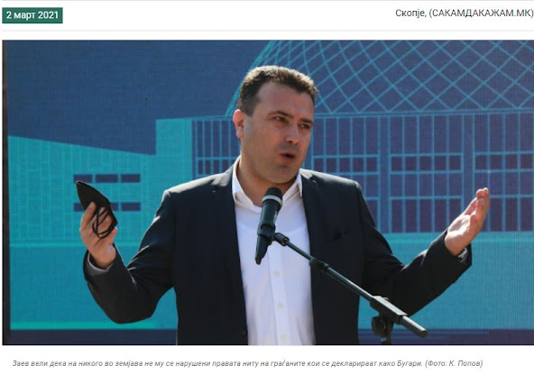 Δεν έχουν παραβιαστεί τα δικαιώματα κανενός στη Δημοκρατία της Βόρειας Μακεδονίας, ούτε των πολιτών εκείνων που αυτοπροσδιορίζονται ως Βούλγαροι, δήλωσε ο πρωθυπουργός της Δημοκρατίας της Βόρειας Μακεδονίας, Ζόραν Ζάεφ, απαντώντας σε δημοσιογραφική ερώτηση, όπως αναφέρει η ιστοσελίδα των Σκοπίων «Σακάμ ντα Καζάμ».