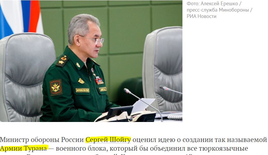 Ο Ρώσος υπουργός Άμυνας Σεργκέι Σόιγκου εκτίμησε την ιδέα της δημιουργίας του λεγόμενου «Στρατού του Τουράν», ενός στρατιωτικού μπλοκ που θα ενώνει όλες τις τουρκόφωνες χώρες.