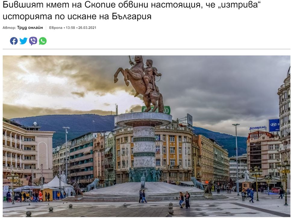 Ο πρώην δήμαρχος των Σκοπίων Κότσε Τραϊανόφσκι κατηγόρησε τον διάδοχό του, Πέτρε Σιλέγκοφ ότι «σβήνει» την ιστορία μετά από αίτημα της Βουλγαρίας αφού ανακοινώθηκε ότι η γέφυρα «Τοντόρ Αλεξαντρόφ» (γνωστή ως δίδυμη γέφυρα) θα μετονομαστεί σε Νάκι Μπαϊράμ και Ρόζα Πλάβεβα» και η λεωφόρος «VMRO» θα πάρει το όνομα του καθηγητή «Μπλάζε Κονέφσκι», γράφει η «Faktor» των Σκοπίων.