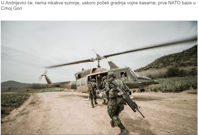 «Το ΝΑΤΟ κοντά στα σερβικά σύνορα. Η Συμμαχία του Κακού έχει μεγαλομανή έργο που μπορεί να πυροδοτήσει ολόκληρα τα Βαλκάνια», έχει τίτλο σερβική εφημερίδα μεγάλης κυκλοφορίας, με πληροφορίες για τη δημιουργία νατοϊκής βάσης στην περιοχή της κωμόπολης Αντριέβιτσα του Μαυροβουνίου.