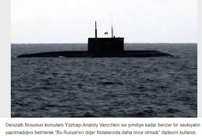 Ο Πλοίαρχος Ανατόλι Βαρόσκιν, διοικητής του υποβρύχιου στόλου, δήλωσε ότι παρόμοια αποστολή δεν είχε πραγματοποιηθεί μέχρι τώρα, τονίζοντας «Αυτό δεν είχε συμβεί ποτέ πριν σε άλλους στόλους της Ρωσίας».