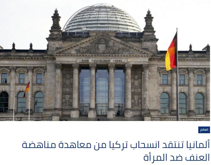 Η εκπρόσωπος του γερμανικού υπουργείου Εξωτερικών δήλωσε ότι η αποχώρηση της Τουρκίας από τη Συνθήκη της Κωνσταντινούπολης, η οποία υπεγράφη το 2011, η οποία στοχεύει στην προστασία των γυναικών από την ενδοοικογενειακή βία, στέλνει λάθος μήνυμα στην Ευρώπη και στις Τουρκάλες.
