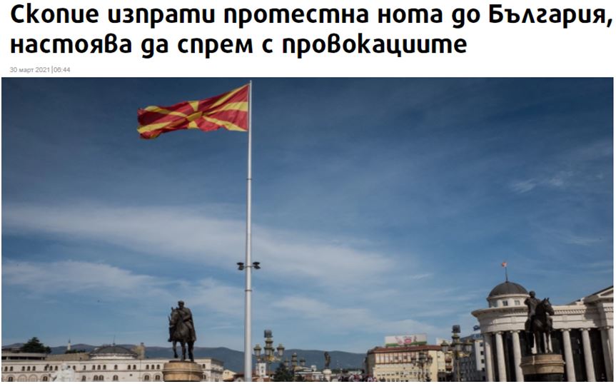 «Τα Σκόπια έστειλαν νότα διαμαρτυρίας στη Βουλγαρία, απαιτώντας να σταματήσουμε να προκαλούμε», έχει τίτλο το δημοσίευμα