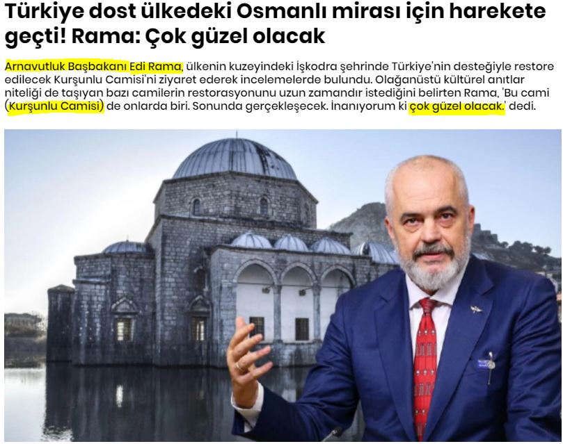 Ο πρωθυπουργός της Αλβανίας, Έντι Ράμα, με την υποστήριξη της Τουρκίας στην πόλη Σκόδρα στο βόρειο τμήμα της χώρας, θα αποκαταστήσει το Τζαμί Κούρσουνλου.