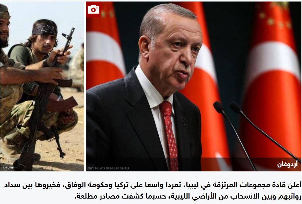 «Οι επικεφαλής μισθοφορικών ομάδων στη Λιβύη κήρυξαν μια ευρεία εξέγερση εναντίον της Τουρκίας και της κυβέρνησης Εθνικής Συμφωνίας, ζητώντας καταρχήν την πληρωμή των μισθών τους και κατόπιν την απόσυρσή τους από την επικράτεια της Λιβύης», όπως αναφέρει αραβικό δημοσίευμα επικαλούμενο αξιόπιστες πηγές