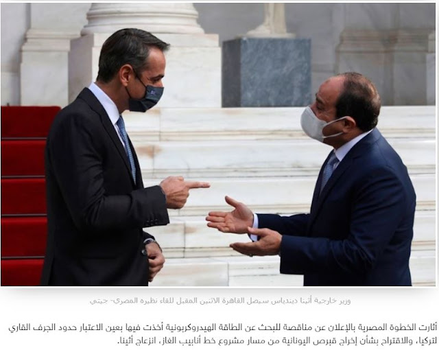 Το δεύτερο σημείο που ενόχλησε την Ελλάδα είναι ότι όταν ο Σίσι επισκέφθηκε την Αθήνα τον περασμένο Νοέμβριο, έκανε μια πρόταση για τη συμφωνία του αγωγού φυσικού αερίου EastMed που υπεγράφη μεταξύ Ελλάδας, Ισραήλ και Ελλάδας τον Ιανουάριο του 2020 με έγκριση των Ηνωμένων Πολιτειών και της Ευρωπαϊκής Ένωσης, στην οποία εξαιρέθηκε η ελληνική Κύπρος.