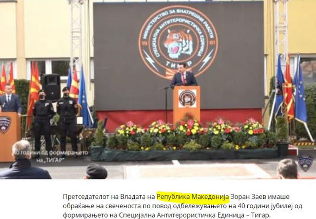 Ο Πρωθυπουργός της «Δημοκρατίας της Μακεδονίας» Ζόραν Ζάεφ μίλησε στην τελετή για την 40η επέτειο από την ίδρυση της Ειδικής Αντιτρομοκρατικής Μονάδας – Τίγρεις, σημειώνει σήμερα το τηλεοπτικό κανάλι 'Kanal 5' επιμένοντας στην παράβλεψη της λέξης «Βόρειας» από την ονομασία της χώρας.