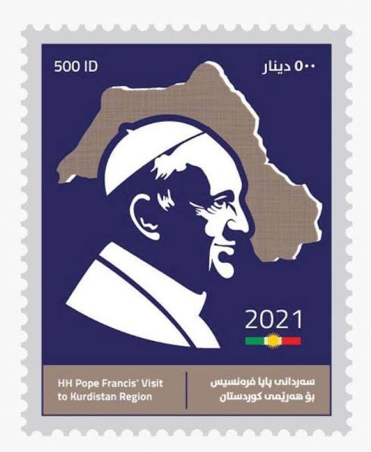 Το γραμματόσημο της ιρακινής περιφέρειας του Κουρδιστάν με αφορμή την επίσκεψη του Πάπα Φραγκίσκου, με φόντο το Μεγάλο Κουρδιστάν