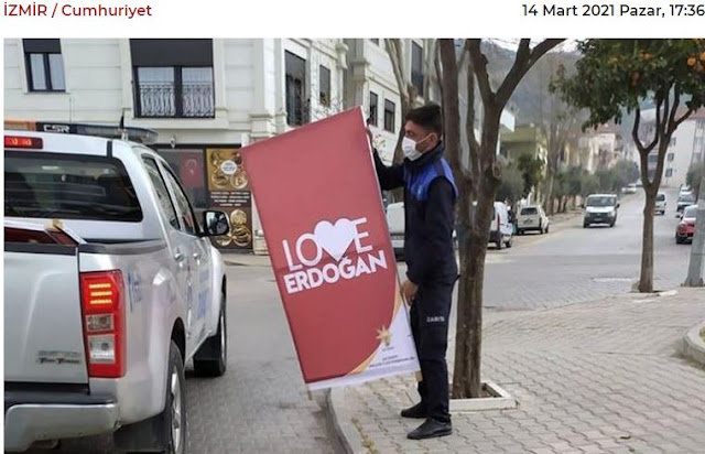 Οι διαφημιστικές αφίσες με την αναγραφή «Love Erdogan» που είχαν τοποθετηθεί σε δημόσιους χώρους στην περιοχή Σελτζούκ της Σμύρνης χωρίς άδεια από το κυβερνών κόμμα ξηλώθηκαν.