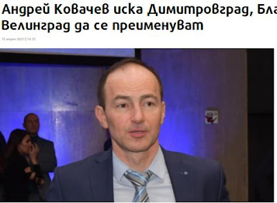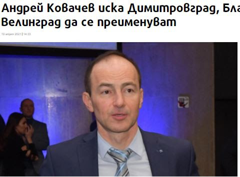 Ο ευρωβουλευτής Αντρέι Κοβάτσεφ κάλεσε τους συναδέλφους του από το κόμμα του Μπόκο Μπορίσοφ- GERB στο Facebook να προτείνουν στην Εθνοσυνέλευση να μετονομάσουν τις πόλεις που φέρουν τα ονόματα κομμουνιστών, όπως Ντιμιτρόβγκραντ, Μπλαγκόεβγκραντ, Βέλινγκραντ και ο οικισμός Βλάντο Τρίτσκοφ.