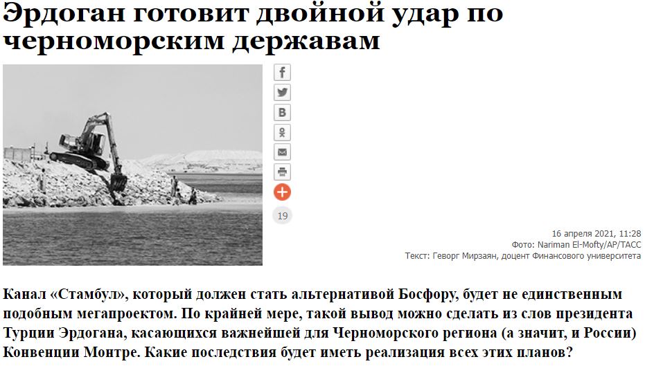 Αλλά τη στιγμή που οι Τούρκοι σκάβουν τα κανάλια, τότε θα μπορούσαν να επιτρέψουν στην αμερικανική ομάδα αεροπλανοφόρων να τα περάσει στον Εύξεινο Πόντο – εφόσον βέβαια οι Ηνωμένες Πολιτείες, για παράδειγμα, σταματήσουν να παρεμβαίνουν στις εσωτερικές υποθέσεις της Τουρκίας και της δώσουν πλήρη ελευθερία κινήσεων στη Μέση Ανατολή.