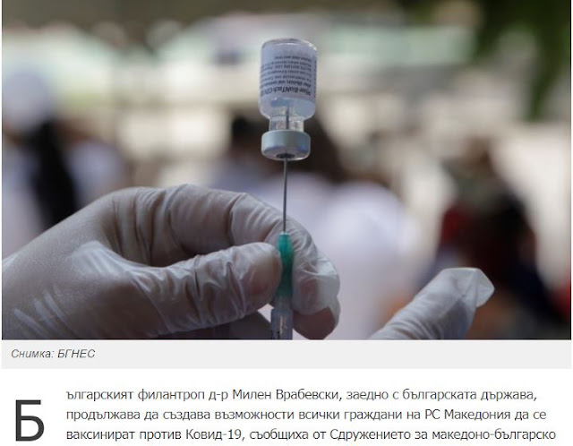 Ο Βούλγαρος ‘φιλάνθρωπος’ Μίλεν Βραμπέφσκι, μαζί με το βουλγαρικό κράτος συνεχίζει να δημιουργεί ευκαιρίες για όλους τους πολίτες της Δημοκρατίας της Βόρειας Μακεδονίας- ΔΒΜ, να εμβολιαστούν κατά του Covid-19, ανακοίνωσε η Ένωση Φιλίας Βόρειας Μακεδονίας-Βουλγαρίας στα Σκόπια.