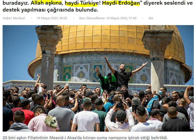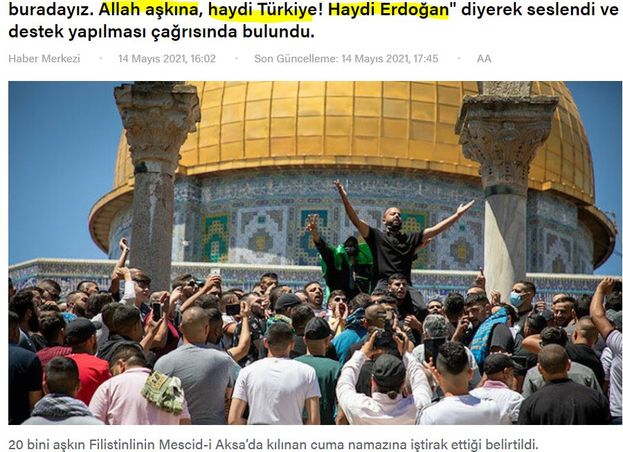 Συνθήματα υπέρ της Τουρκίας και του Προέδρου Ρετζέπ Ταγίπ Ερντογάν ακούστηκαν μετά την προσευχή της Παρασκευής στο τέμενος αλ Ακσά, το οποίο είχε μετατραπεί σε έδαφος μάχης με τους Ισραηλινούς, όπως σημειώνει η τουρκική Yeni Safak.