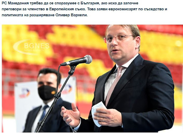 Αυτό υπαινίχθηκε ο Ευρωπαίος Επίτροπος για τη διεύρυνση, Όλιβερ Βαρχέλι, τονίζοντας ότι η Βόρεια Μακεδονία πρέπει να καταλήξει σε συμφωνία με τη Βουλγαρία εάν επιθυμεί να ξεκινήσει διαπραγματεύσεις για ένταξη στην Ευρωπαϊκή Ένωση.