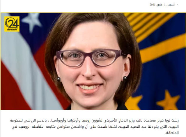 Ο βοηθός υφυπουργός Άμυνας των ΗΠΑ με αρμοδιότητα για τη Ρωσία, την Ουκρανία και την Ευρασία, Λόρα Κούπερ, χαιρέτισε τη ρωσική υποστήριξη προς την κυβέρνηση της Λιβύης, με επικεφαλής τον Αμπντούλ Χαμίντ αλ Νταμπάιμπα, αλλά τόνισε ότι η Ουάσινγκτον θα συνεχίσει να παρακολουθεί τις ρωσικές δραστηριότητες στην περιοχή.