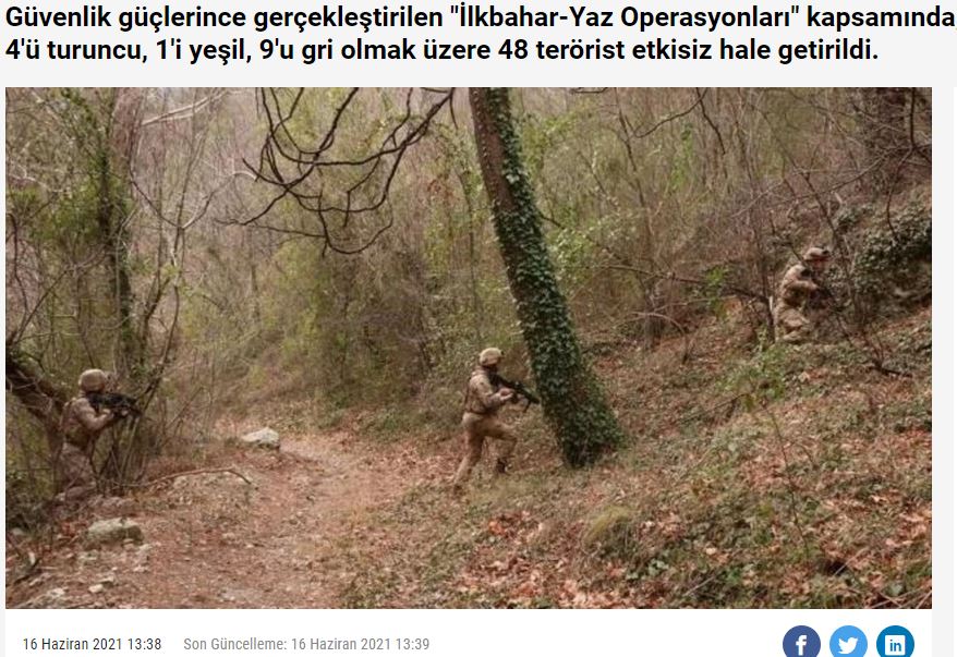 Το δημοσίευμα επισημαίνει ότι οι κομάντο της στρατοχωροφυλακής και μέλη των ειδικών επιχειρήσεων έχουν προγραμματίσει μέχρι την 1η Οκτωβρίου, 9.630 επιχειρήσεις κατά των Κούρδων αυτονομιστών, ενώ μέχρι σήμερα έχουν υλοποιηθεί 3.801. Σκοτώθηκαν 48 Κούρδοι αυτονομιστές, εντοπίστηκαν 298 καταφύγια και σπήλαια, εξουδετερώθηκαν 159 νάρκες, κατασχέθηκαν 99 χειροβομβίδες, 35 ραδιόφωνα, 8,2 τόνοι τροφίμων και υλικά διαβίωσης.