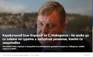 Αυτό δήλωσε στη σελίδα του στο Facebook ο αρχηγός της «Εσωτερικής Μακεδονικής Επαναστατικής Οργάνωσης»- VMRO, Κρασιμίρ Καρακατσάνοφ με την ευκαιρία της σημερινής επίσκεψης του Πρωθυπουργού της Βόρειας Μακεδονίας, Ζόραν Ζάεφ, και της πρώτης του συνάντησης με τον πρώην πρωθυπουργό Μπόικο Μπορίσοφ, γράφει η βουλγαρικής «Σήμερα».
