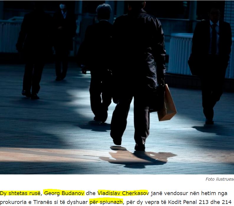 Δύο Ρώσοι πολίτες, ο Γκεόργκ Μπουτάνοφ και ο Βλαντισλάβ Τσερκάσοφ, ανακρίνονται από την εισαγγελία των Τιράνων με την υποψία κατασκοπείας, αδικήματα βάσει του Ποινικού Κώδικα 213 και 214, που αφορούν την λήψη και τη μεταφορά πληροφοριών.