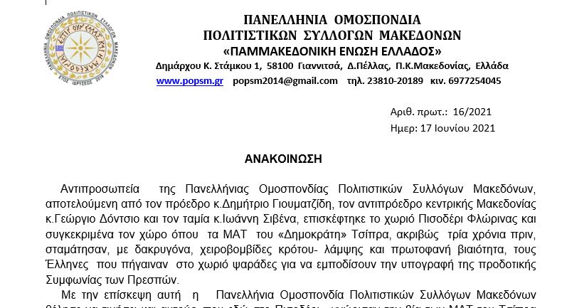 Αντιπροσωπεία της Πανελλήνιας Ομοσπονδίας Πολιτιστικών Συλλόγων Μακεδόνων, αποτελούμενη από τον πρόεδρο κ. Δημήτριο Γιουματζίδη, τον αντιπρόεδρο κεντρικής Μακεδονίας κ.Γεώργιο Δόντσιο και τον ταμία κ.Ιωάννη Σιβένα, επισκέφτηκε το χωριό Πισοδέρι Φλώρινας και συγκεκριμένα τον χώρο όπου τα ΜΑΤ του «Δημοκράτη» Τσίπρα, ακριβώς τρία χρόνια πριν, σταμάτησαν, με δακρυγόνα,