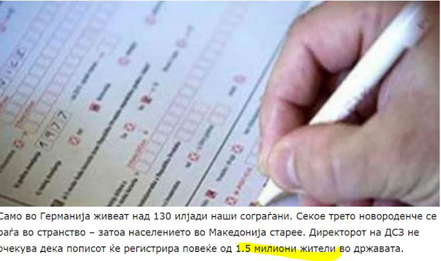 «Μόνο στη Γερμανία ζουν πάνω από 130 χιλιάδες συμπολίτες μας. Κάθε τρίτο νεογέννητο γεννιέται στο εξωτερικό - γι 'αυτό ο πληθυσμός στη Βόρεια Μακεδονία γερνά. Δεν περιμένων η απογραφή να εγγράψει περισσότερα από 1,5 εκατομμύρια άτομα στη χώρα», δήλωσε ο Αποστόλ Σιμόφσκι, σύμφωνα με τα ΜΜΕ των Σκοπίων.
