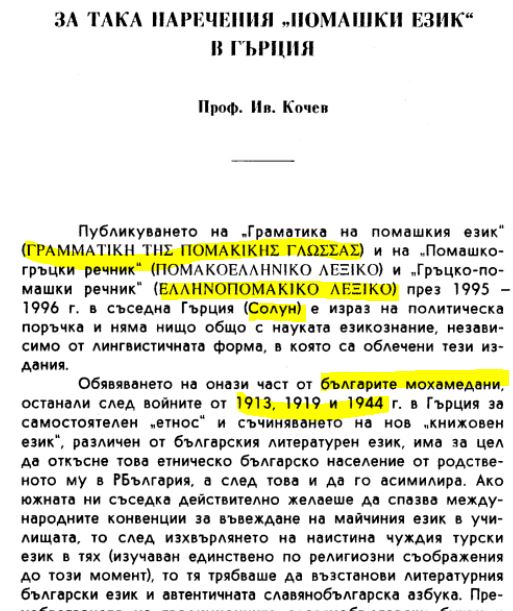 «Η διακήρυξη αυτού του μέρους των Βουλγάρων Μουσουλμάνων που παρέμειναν μετά τους πολέμους του 1913, 1919 και 1944 στην Ελλάδα ως ανεξάρτητης «εθνοτικής ομάδας» και της δημιουργίας μιας νέας «φιλολογικής γλώσσας» διαφορετικής από τη βουλγαρική φιλολογική γλώσσα, αποσκοπεί στο διαχωρισμό αυτού του εθνοτικά βουλγαρικού πληθυσμού από τους συγγενείς του στη Δημοκρατία της Βουλγαρίας, και στη συνέχεια να τον αφομοιώσει».