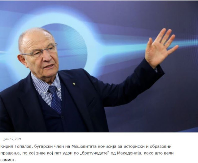 Ο Κιρίλ Τοπάλοφ, μέλος της βουλγαρικής Μικτής Επιτροπής για Ιστορικά και Εκπαιδευτικά Θέματα, έχει αντιδράσει πολλές φορές στις θέσεις των «εξαδέλφων» από τη Βόρεια Μακεδονία.