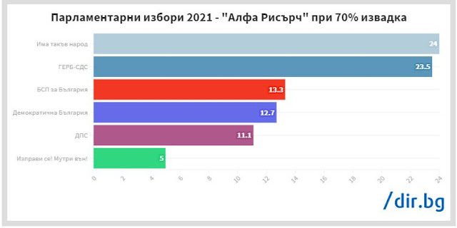 Σύμφωνα με τη βουλγαρική «Dnes» πρώτη πολιτική δύναμη με 24 τοις εκατό αναδεικνύεται το κόμμα «Υπάρχει τέτοιος λαός»- ΙΤΝ, ακολουθεί ο συνασπισμός των GERB-UDF με 23,5 τοις εκατό.