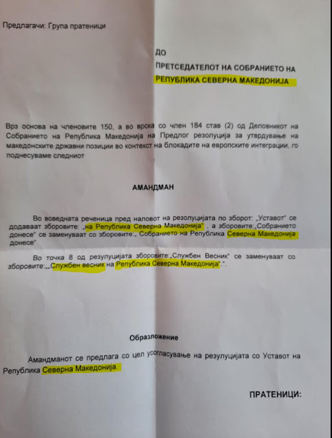 Το κόμμα του πρωθυπουργού Ζόραν Ζάεφ, υπέβαλε τροποποίηση στο ψήφισμα για τις «Κόκκινες Γραμμές» και έτσι το συνταγματικό όνομα του κράτους "Δημοκρατία της Βόρειας Μακεδονίας" προστίθεται στο περιεχόμενο, αναφέρει σε σχετική ανακοίνωση το SDSM.