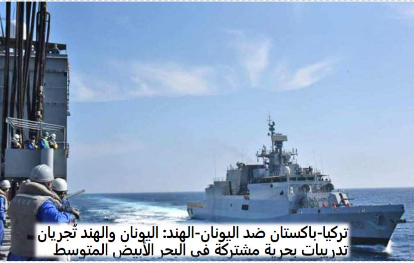 Δημοσίευμα για την «Αραβική Άμυνα» αναφέρεται στις κοινές ναυτικές ασκήσεις της Ελλάδας και Ινδίας που πραγματοποιήθηκαν στην υπεράκτια περιοχή νοτιοδυτικά της Κρήτης από το πολεμικό σκάφος της Ινδίας «INS Tabar» με τη φρεγάτα «Θεμιστοκλής».