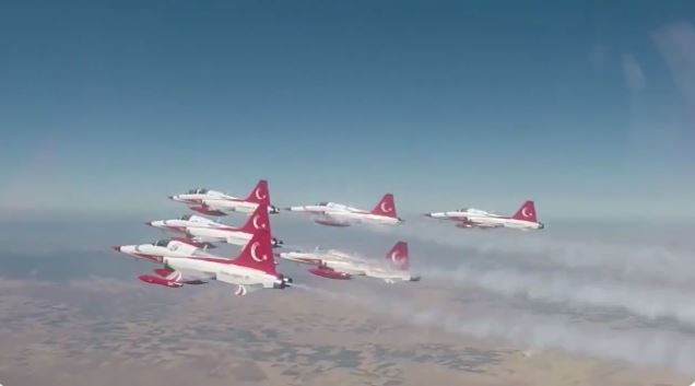 Τουρκικά μαχητικά σχημάτισαν την ημισέληνο και το αστέρι στον ουρανό της «Τουρκικής Κύπρου» σε σχέση με το σύμβολο που φέρουν οι σημαίες των δύο χωρών.