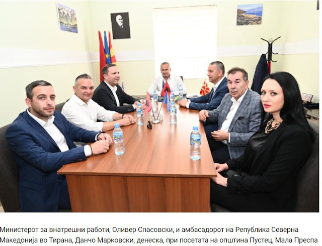 Ο Υπουργός Εσωτερικών Όλιβερ Σπασόφσκι και ο πρέσβης της Δημοκρατίας της Βόρειας Μακεδονίας στα Τίρανα, Ντάντσο Μαρκόφσκι, κατά τη διάρκεια της σημερινής επίσκεψης στο δήμο Πούστετς στη Μάλα Πρέσπα στην Αλβανία, μαζί με τους οικοδεσπότες τους Βασίλ Στεργιόσκι, βουλευτής στο