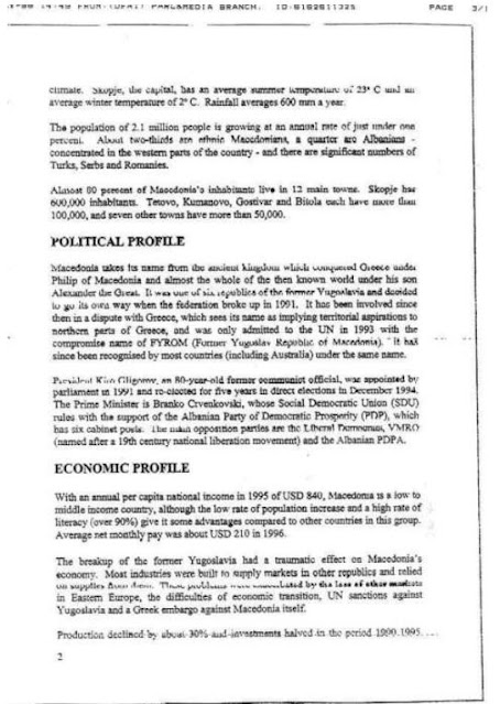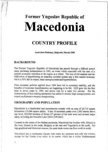 «Η Μακεδονία πήρε το όνομά της από το αρχαίο βασίλειο που κατέκτησε την Ελλάδα υπό την ηγεσία του Φιλίππου της Μακεδονίας, καθώς και σχεδόν ολόκληρου του τότε γνωστού κόσμου, κατά τη διάρκεια της βασιλείας του γιου του Αλεξάνδρου του Μεγάλου - διαβάζει το έγγραφο που δημοσιεύθηκε τον Μάρτιο του 1998.