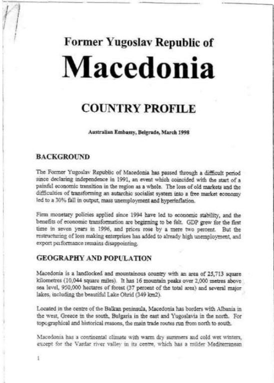 Στο επίσημο έγγραφο, μόνο στην αρχή χρησιμοποιείται ο όρος FYROM, ενώ η χώρα αναφέρεται ως Μακεδονία. Παρέχει επίσης γενικά στοιχεία σχετικά με τη γεωγραφική θέση, την πολιτική και οικονομική κατάσταση, καθώς και τον πληθυσμό στη ‘Μακεδονία’. Αλλά η εξήγηση για την προέλευση του ονόματος του κράτους προσέλκυσε τη μεγαλύτερη προσοχή.