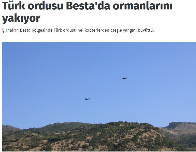 Στην περιοχή Μπέστα του Σιρνάκ, ο τουρκικός στρατός διεύρυνε το μέτωπο της φωτιάς με ελικόπτερα.