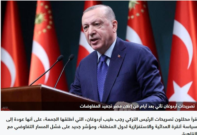 Οι αναλυτές χαρακτήρισαν τις δηλώσεις του Τούρκου Προέδρου Ρετζέπ Ταγίπ Ερντογάν, τις οποίες έκανε την Παρασκευή, ως επιστροφή στην εχθρική και προκλητική πολιτική της Άγκυρας για τις χώρες της περιοχής, και μια νέα ένδειξη της αποτυχίας της διαπραγματευτικής γραμμής με το Κάιρο.