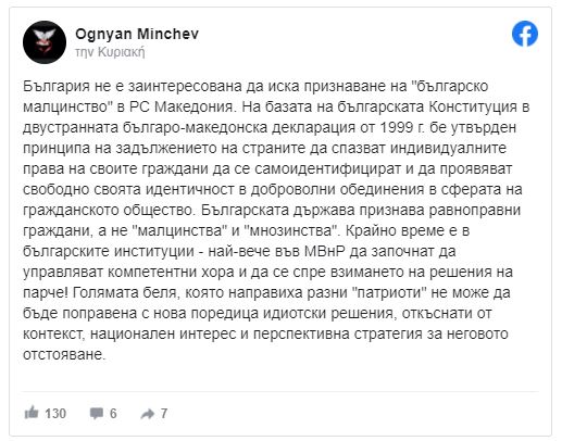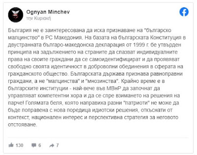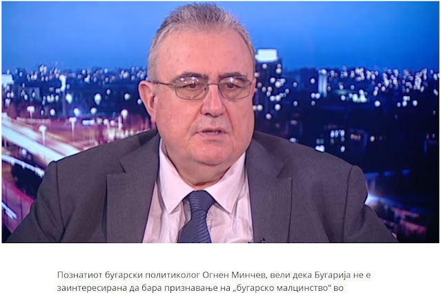 «Το βουλγαρικό κράτος αναγνωρίζει ίσους πολίτες και όχι μειονότητες ή πλειοψηφίες», ανέφερε ο γνωστός πολιτικός επιστήμονας της Βουλγαρίας, Όγκνιαν Μίντσεφ, τονίζοντας ότι η Βουλγαρία δεν ενδιαφέρεται να ζητήσει την αναγνώριση της «βουλγαρικής μειονότητας» στη Βόρεια Μακεδονία».