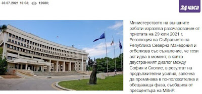 Το Υπουργείο Εξωτερικών είναι απογοητευμένο με το ψήφισμα της Συνέλευσης της Δημοκρατίας της Βόρειας Μακεδονίας που εκδόθηκε στις 29 Ιουλίου 2021 και σημειώνει με λύπη ότι αυτή η πράξη έρχεται σε μια στιγμή που ο διμερής διάλογος μεταξύ Σόφιας και Σκοπίων, ως αποτέλεσμα των συνεχιζόμενων προσπαθειών , έχει αρχίσει να μπαίνει σε μια πιο θετική και πολλά υποσχόμενη φάση, ανακοίνωσε το κέντρο Τύπου του Υπουργείου Εξωτερικών.
