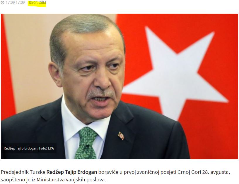 Ο Τούρκος πρόεδρος Ρετζέπ Ταγίπ Ερντογάν θα επισκεφθεί το Μαυροβούνιο στις 28 Αυγούστου, όπως ανακοινώθηκε κατά τη συνάντηση του υπουργού Εξωτερικών του Μαυροβουνίου Τζορτζ Ραντούλοβιτς με τον Τούρκο ομόλογό του Μεβλούτ Τσαβούσογλου στο Κίεβο.