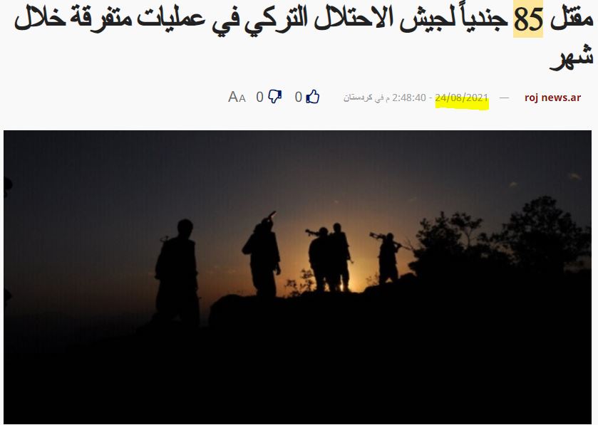 Οι Λαϊκές Δυνάμεις Άμυνας (HPG) ανακοίνωσαν τη δολοφονία 85 Τούρκων στρατιωτών μέσα σε ένα μήνα στο πλαίσιο των δύο επαναστατικών εκστρατειών των Γερακών του Ζάγκρου και της Αντίστασης του Χαμπούρ.