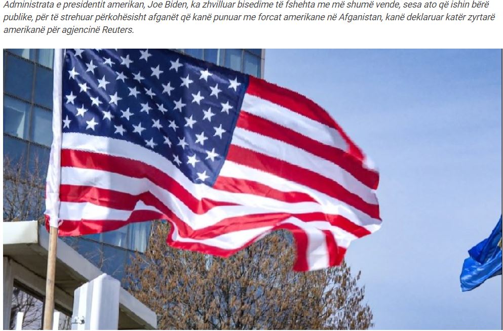 Η διοίκηση του προέδρου των ΗΠΑ, Τζο Μπάιντεν, πραγματοποίησε μυστικές συνομιλίες με περισσότερες χώρες από όσες έγινε γνωστό, για την προσωρινή στέγαση Αφγανών που συνεργάστηκαν με τις αμερικανικές δυνάμεις στο Αφγανιστάν, δήλωσαν στο Reuters τέσσερις Αμερικανοί αξιωματούχοι, σύμφωνα με αλβανικό δημοσίευμα.