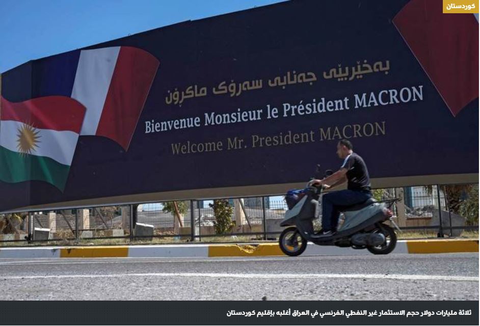 Ο επικεφαλής του οικονομικού τμήματος στο Γαλλικό Προξενείο στην Ερμπίλ, Μουχάμαντ Φαίντι, ανακοίνωσε ότι οι συνολικές γαλλικές επενδύσεις στο Ιράκ στους οικονομικούς τομείς, εξαιρουμένου του πετρελαίου και του φυσικού αερίου, ανέρχονται σε τρία δισεκατομμύρια δολάρια και ότι το μεγαλύτερο μέρος αυτών των επενδύσεων βρίσκονται στην περιοχή του Κουρδιστάν.