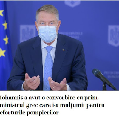 Ο Έλληνας πρωθυπουργός μετέφερε στον αρχηγό του κράτους τις ιδιαίτερες ευχαριστίες του, εκ μέρους του ελληνικού λαού για την υποστήριξή τους στον αγώνα κατά των πυρκαγιών στην Ελλάδα μέσω της αποστολής των Ρουμάνων πυροσβεστών που ανταποκρίθηκαν άμεσα στο κάλεσμα των ελληνικών αρχών.